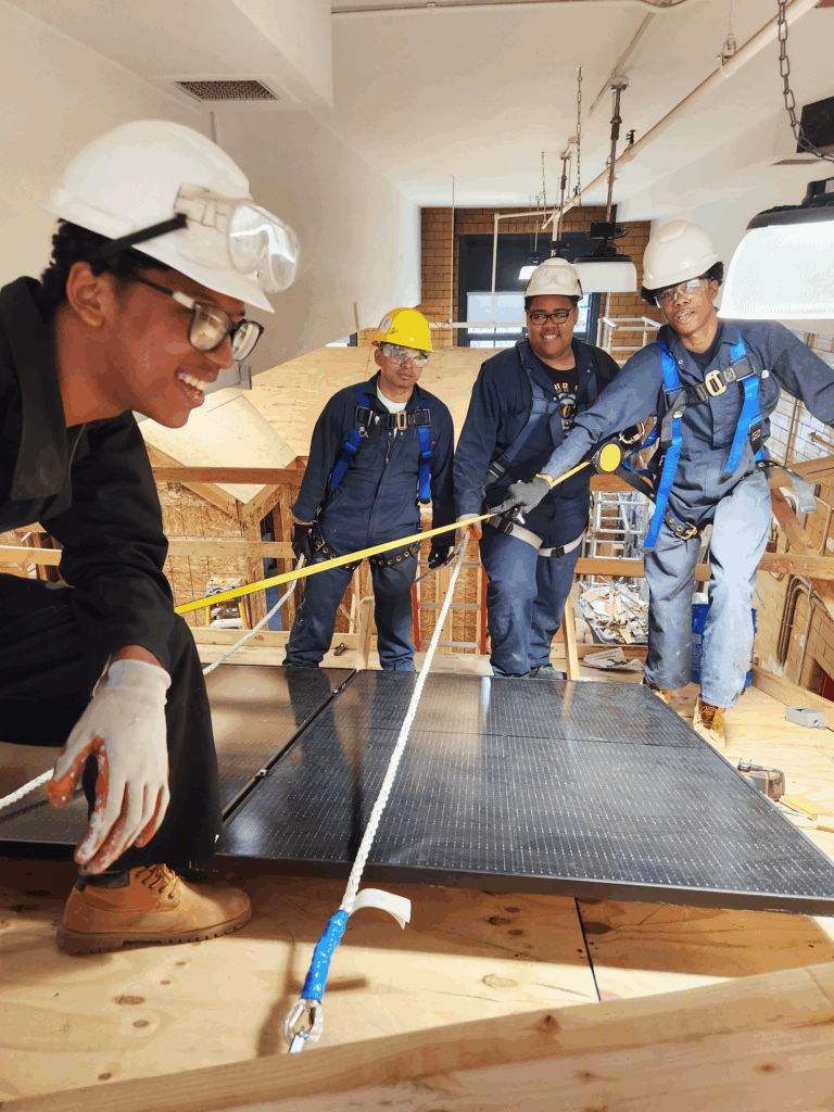 Bronx Design & Construction Academy high school students participate in Solar One’s Green Design Lab class focusing on grid-tied solar installation on a full-scale and to-code house built by the students.