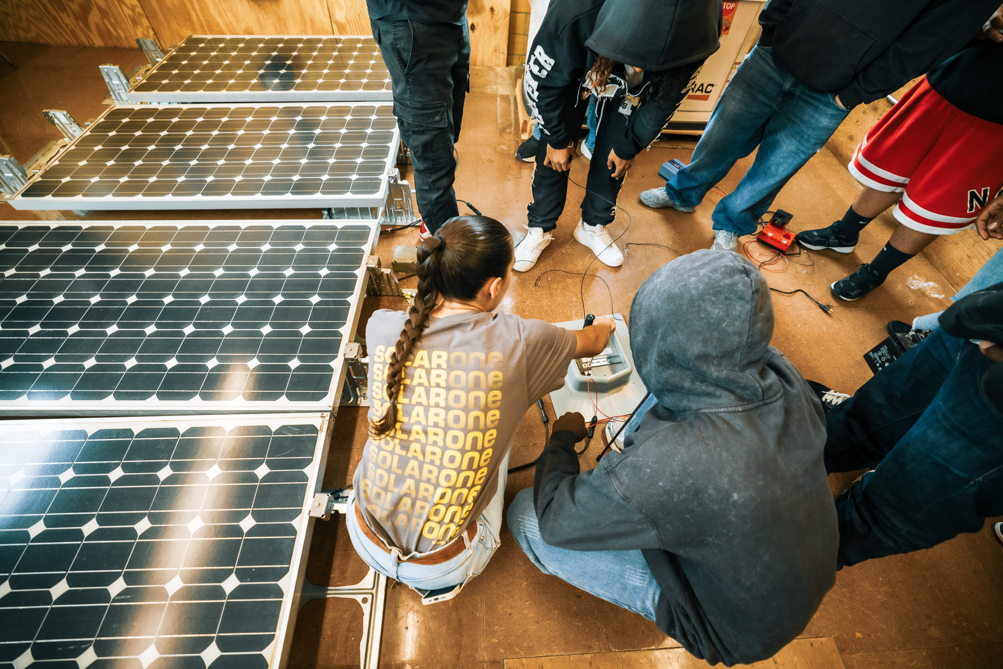 Bronx Design & Construction Academy students during a Solar One Career and Technical Education (CTE) lesson about solar power, panels, and installation